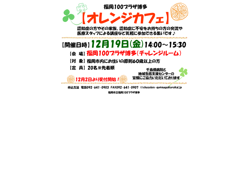 [12/19] オレンジカフェ - Category - TOPお知らせ, オレンジカフェ 認知症の方やその家族、認知症に不安をお持ちの方の 交流や医療スタッフによる講座など 気軽に参加できる集いです。 千鳥橋病院と地域包括支援センターの皆様に ご協力いただいております。